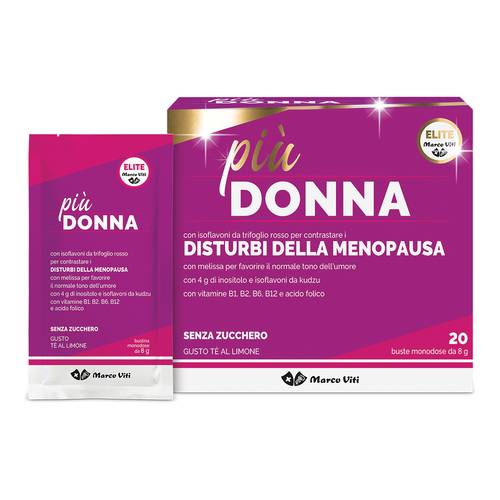 PIÙ DONNADescrizione Formulato per fornire un supporto integrativo alla donna nella fase della premenopausa e nel periodo della menopausa. Contiene isoflavoni da trifoglio rosso, in grado di contrastare i disturbi della menopausa, e kudzu titolato in isoflavoni, pianta coltivata in Asia orientale. La formulazione è arricchita dall’estratto di melissa che favorisce il normale tono dell’umore. La vitamina B1 contribuisce alla normale funzione psicologica, la B2 del sistema nervoso; la vitamina B6 favorisce la fisiologica regolazione dell’attività ormonale, l’acido folico contribuisce a ridurre la stanchezza. Inositolo al massimo dosaggio ...